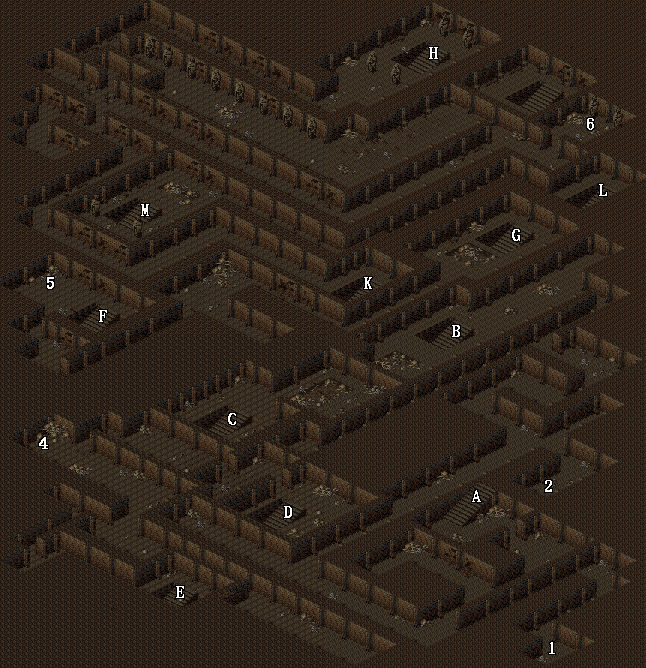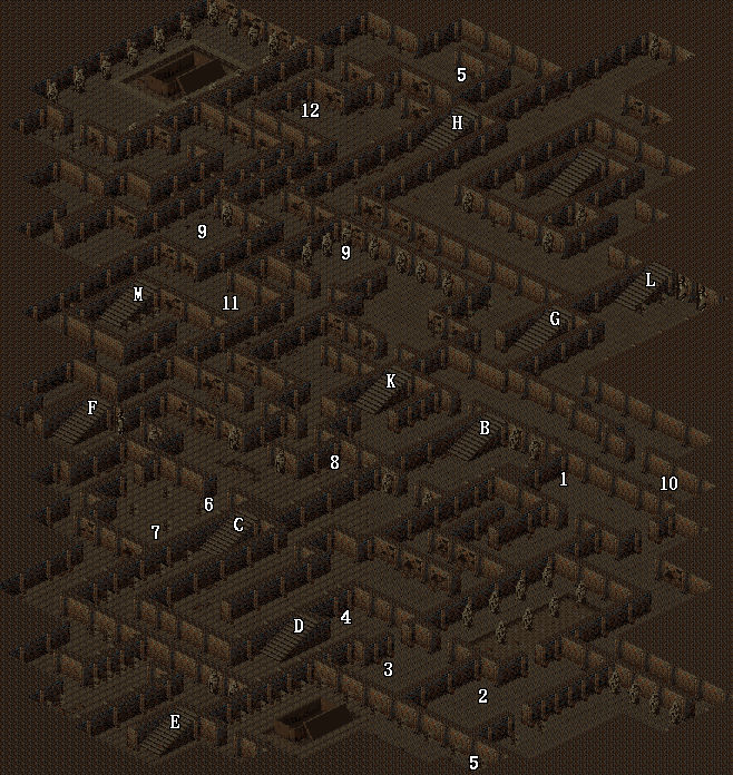 1.梅花鏢 2.金創藥 3.100文錢 4.蜂王蜜 5.1000文錢 6.鐵履 A.亂葬崗 B~M.將軍塚下層(相同字母樓梯) |