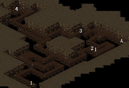 1.銀釵 2.銅鏡 3.珍珠 4.玉鐲 5.鐵履 6.妖狐女(狐狸精) 7.隱蠱 8.由左至右為金蠶王、孟婆湯、酒、600錢、500錢、400錢、300錢、200錢、100錢 A.隱龍窟第三層上層 B.石門 |