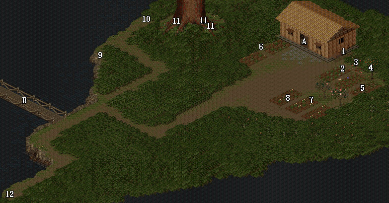 1.蠱x9 2.血海棠 3.試煉果x2 4.鼠兒果(無限) 5.忘魂花x2 6.香蕉x2 7.九節菖蒲 8.龍涎草 9.醍醐香 10.紫罌粟 11.靈山仙芝 12.鬼枯藤 A.聖姑家 B.靈山山腳東側 |