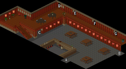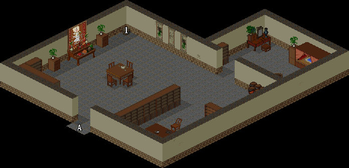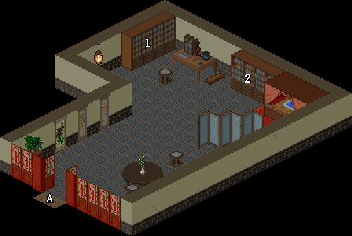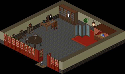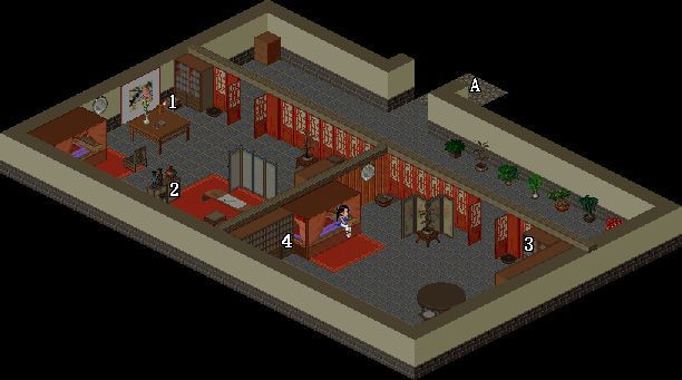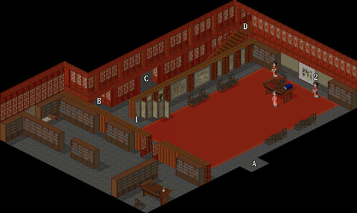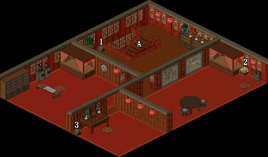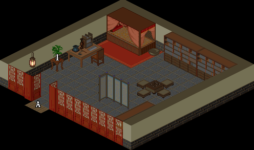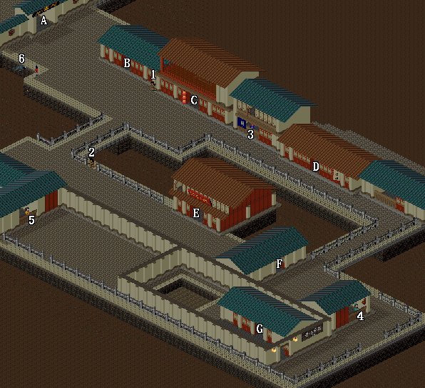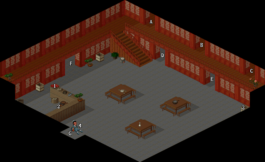 | 1.乞丐A 2.乞丐B 3.當鋪 4.藥鋪 5.雜貨店 6.酒劍仙 A.尚書府 B.古董商家 C.酒館 D.兵器鋪 E.怡紅院 F.民宅 G.貴妃香浴 |