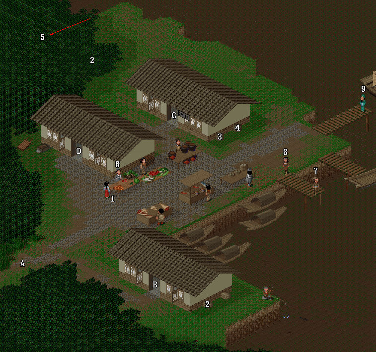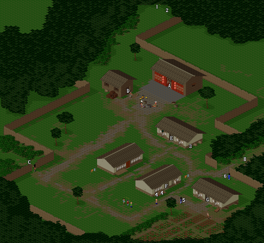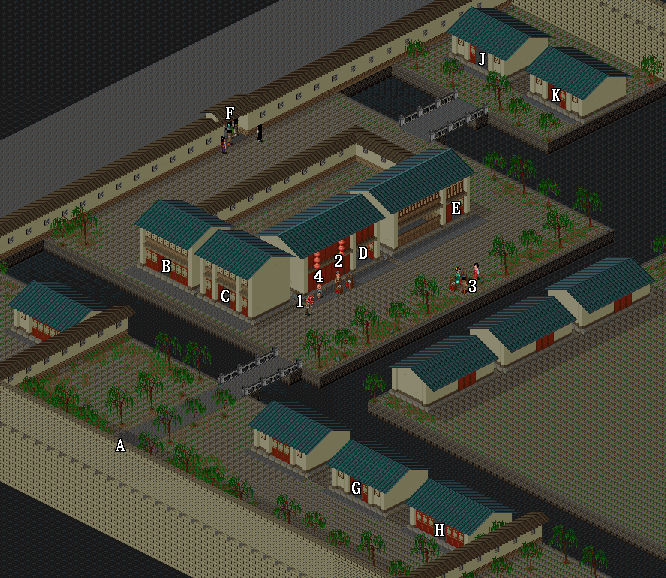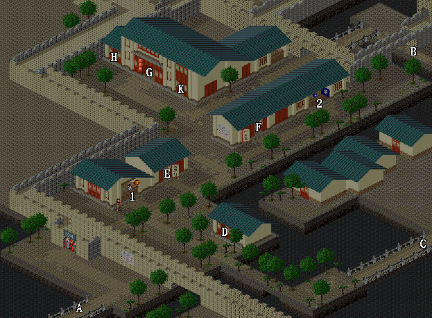 | 1.糖葫蘆小販 2.賣吃小販 3.雜貨小販 4.小豆子 A.蘇州城外 B.藥鋪 C.當鋪 D.客棧 E.兵器鋪 F.林家堡 G.民房一 H.民房二 J.民房三 K.民房四 |