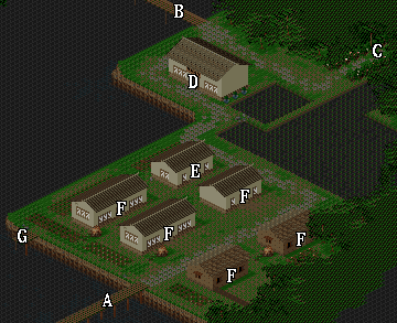 | A.白河村南郊 B.白河村北郊 C.村長家庭院 D.駱記米行 E.漁夫家 F.民宅 G.釣魚處 |