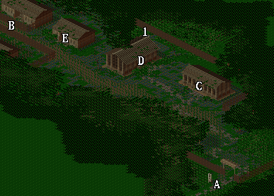 | 1.蟠果 2.阿桃 A.桃花林東側北部 B.桃花林西側 C.民居一 D.民居二 E.民居三 F.民居四 G.民居五 |