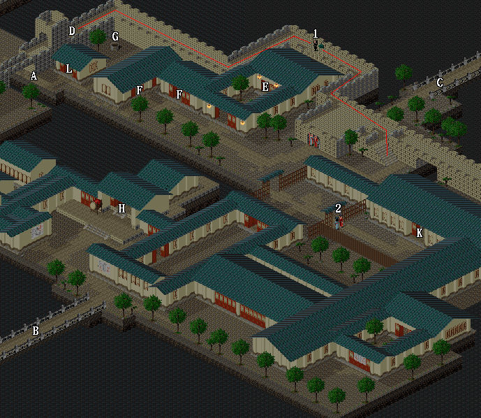 | 1.女飛賊 2.監牢衙役 A.揚州城(南)B B.揚州城(南)C C.揚州城北郊 D.往城牆南段D E.姬三娘宅 F.民宅 G.井 H.衙門 K.監牢 L.廢宅 |