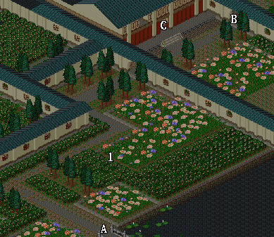 | A.尚書府後花園 B.劉晉元臥房 C.花房 |