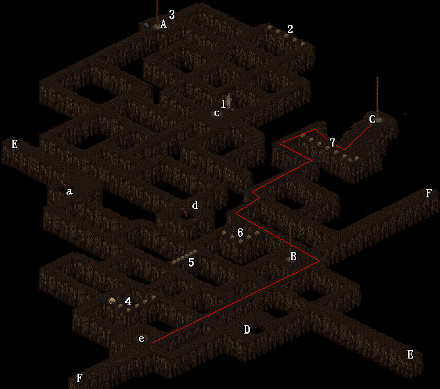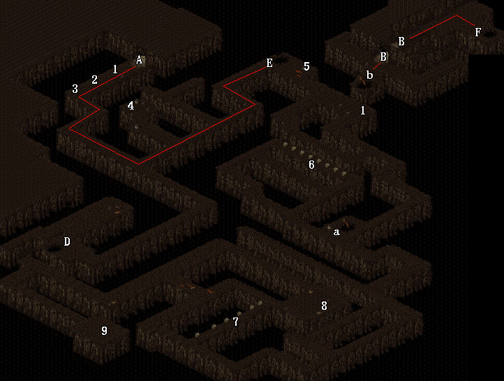 | 1.苗刀 2.蠱x9 3.碧血蠶 4.鬼牙刀 5.豹牙手環 6.碧血蠶、食妖蟲x2、綑仙繩x2、驅魔香、吸星鎖x2 7.吸星鎖x2、金蠶王、九陰散、赤血蠶、靈蠱 8.鳳凰羽毛 9.鬼頭杖 A.試煉窟第四層 D~E.對應下一層小寫字母 F.到傳送層 |
