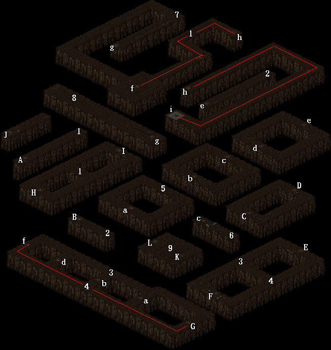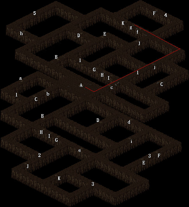 | 1.無影毒 2.傀儡蟲 3.爆烈蠱 4.金蠶王 5.金蠶蠱 A.第五層掉落處 B~K.傳送至相同字母 a~j.傳送至下層大寫字母 |
